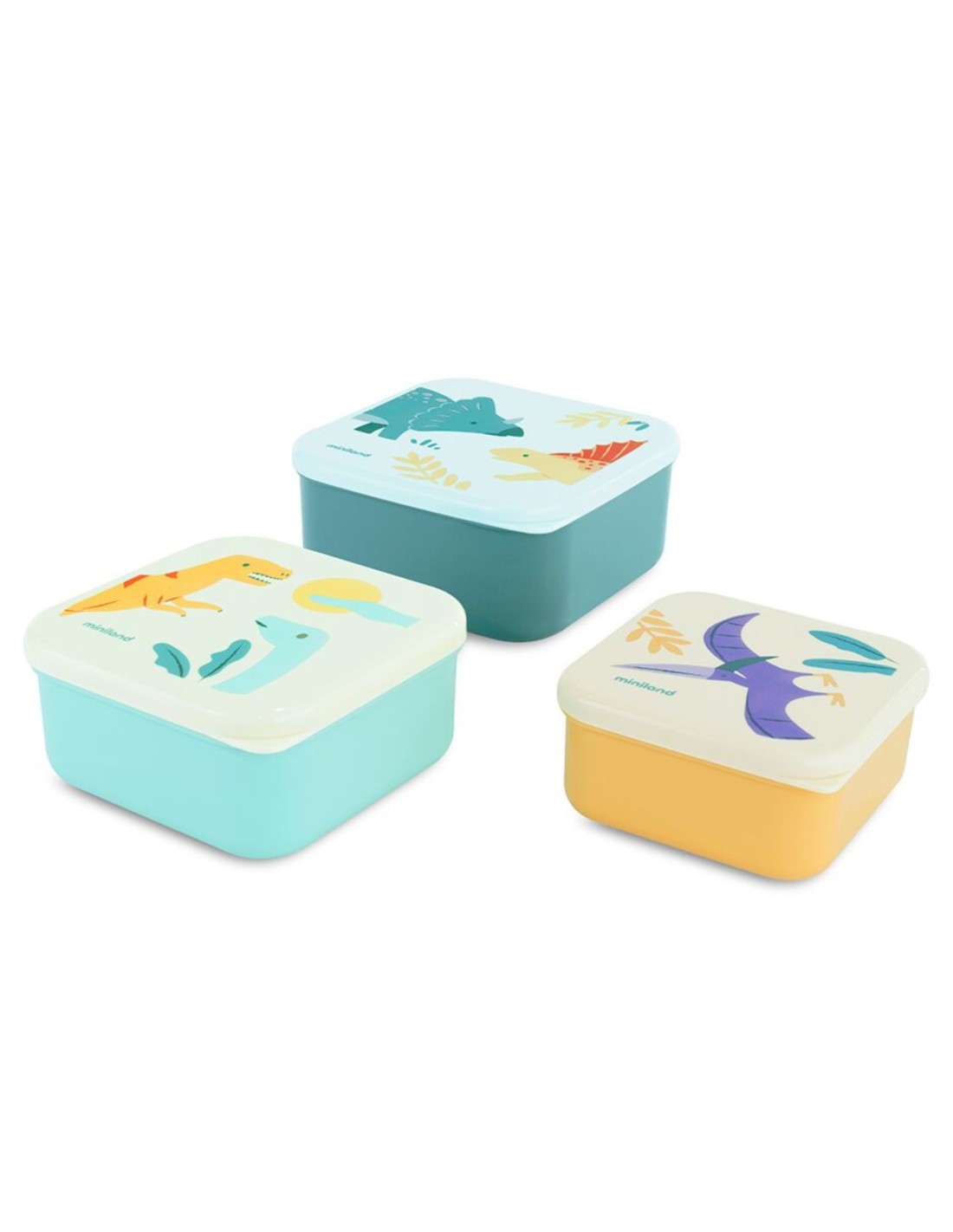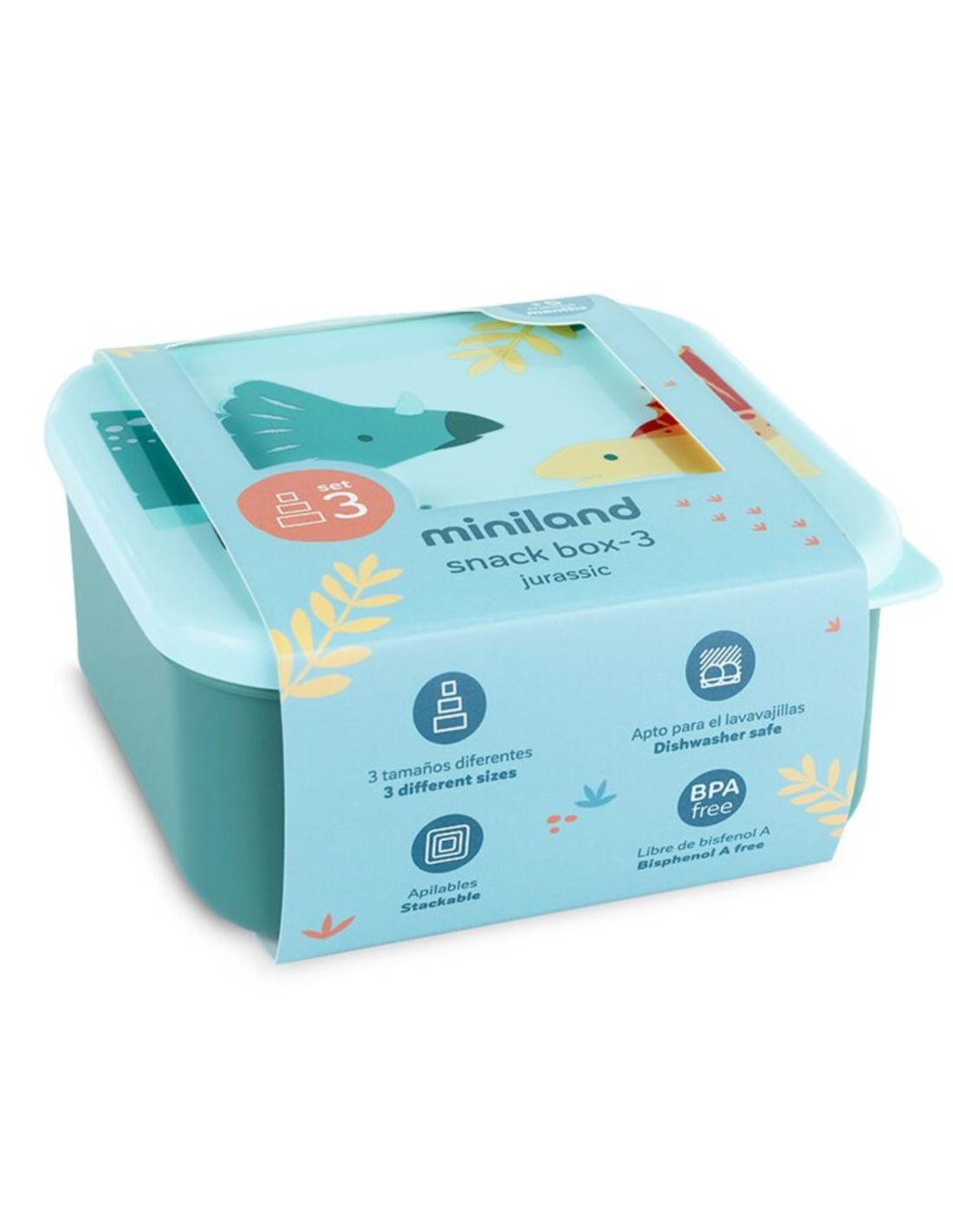 El set Snackbox-3 Jurassic de Miniland es perfecto para organizar y transportar la comida de los más pequeños de forma segura y divertida.