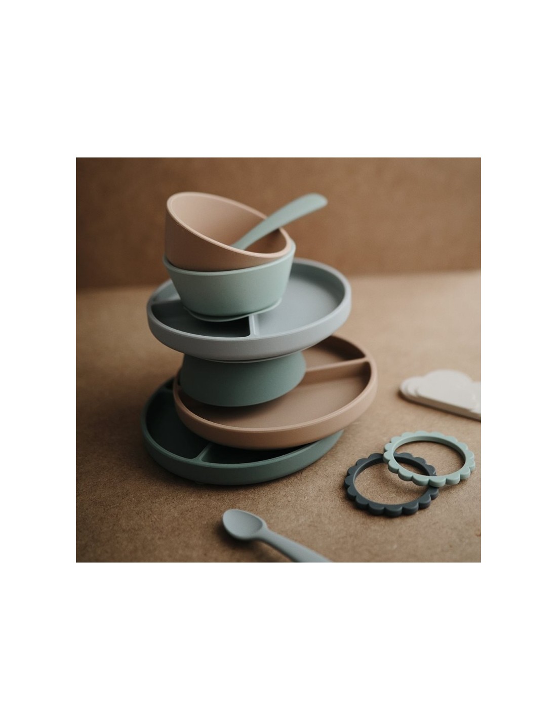 – Plato con ventosa: silicona de grado alimentario, apta para contacto con alimentos y resistente al uso diario.